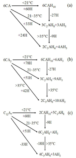 1鋁酸鈣水泥中CA(a)、CA2(b)和C12A7(c)的水化反應