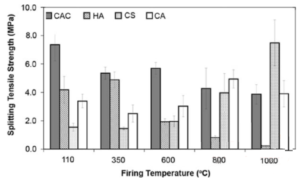 圖2水合結合澆注料(CAC:含4wt%鋁酸鈣水泥;HA:含4wt%水合氧化鋁)和溶膠結合澆注料(CS:含4wt%固體含量的氧化硅溶膠;CA:含4wt%固體含量的氧化鋁溶膠)劈裂抗拉強度與煅燒溫度的關系。