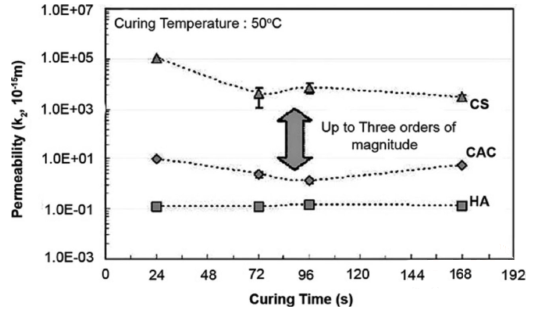 圖3不同結合系統(CAC:鋁酸鹽水泥;HA:水合氧化鋁;CS:氧化硅溶膠)澆注料經50℃養護后透氣率的變化。