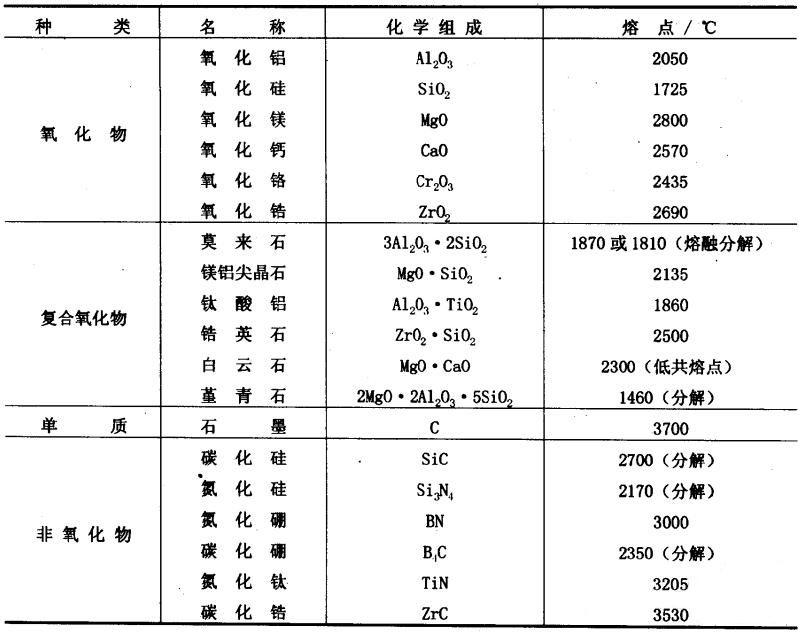 主成分是構成耐火原料的主題,它的性質與數量直接決定著耐火原料的質量。主成分也可以是高熔點的氧化物,如氧化鋁(Al2O3),氧化硅(SiO2),氧化鎂(MgO)等,或者是復合氧化物如莫來石(3Al2O3·2SiO2),鎂鋁尖晶石(MgO·Al2O3)等,也可以是某些單質和非氧化物,如碳和石墨(C),碳化硅(SiC),氮化硼(BN)等。耐火原料常見氧化物、復合氧化物、單質和非氧化物的熔點列于表1中。