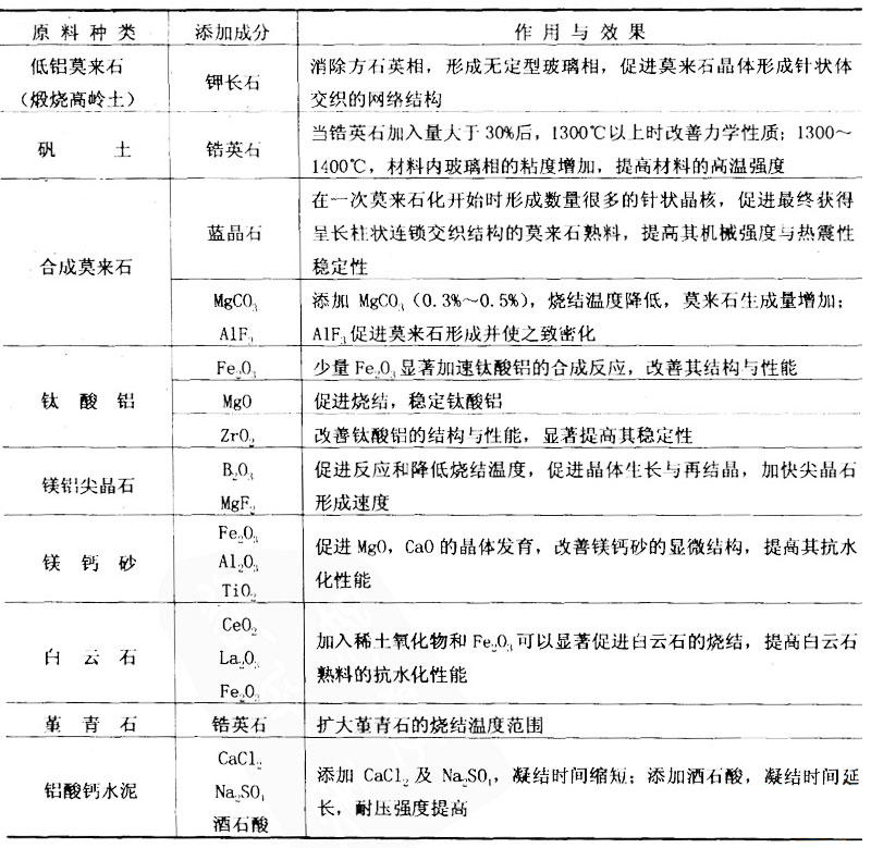 在耐火原料研究與生產中,為了促進其高溫物相變化和降低燒結溫度或擴大燒結溫度范圍,有時添加少量其它成分。按共作用不同通常有礦化劑、穩定利、燒結劑等,它們的加入量很少,但卻能明顯地降低原料的生產成本或改善耐火原料的性能。添加成分的作用與機理是耐火原料燒結研究中的重點,受到普遍重視。一些耐火原料的添加成分與作用效果列于表2中。