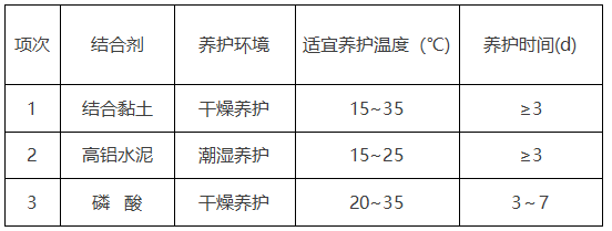 16)耐火澆注料在施工后,應按設計規定的方法養護。如無特殊規定,可按表的規定進行。耐火澆注料養護期間,不得受外力及振動。