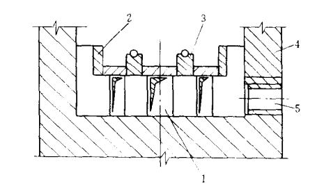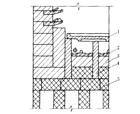 4 貫通式熱處理爐爐底的砌筑1-煙道;2-擋板磚;3-導軌磚;4-爐墻;5-噴嘴