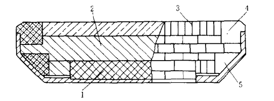 5 臺車的砌筑1-硅藻土磚;2-耐火粘土磚;3-鎂磚;4-側板磚;5-三角磚