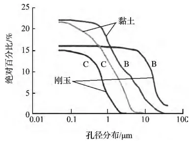 在選擇最佳的技術路線時,無論對于不定形耐火材料還是燒成耐火制品,都可能獲得相近的密度。然而,產品的區別在于它們的結構。對耐火澆注料而言,重點是控制混合物的流變性,這就是為什么要精細地控制顆粒的尺寸分布,并且使用超細粉甚至納米顆粒。不定形耐火材料的微孔結構最為典型。在致密的燒成磚中,典型的氣孔尺寸為20~25μm,有些特殊的制品可達5μm。在澆注料中,即使經過燒成,其氣孔的中位徑通常不超過1~2μm。兩種典型的耐火澆注料和耐火磚(黏土質和高鋁質)的孔徑分布的對比見圖。