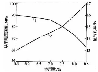 從圖中看出,隨著低水泥耐火澆注料水用量的增加,其強度降低,顯氣孔率增大。最新研究結果證明,低水量不但能使低水泥耐火澆注料的總孔隙量降低,而且能加速鋁酸鹽水泥的早期水合作用,使水化物含有較少的結合水,同時單位膠結能力有所增強,因此有助于提高其常溫、烘干和中溫強度。應當指出,低水泥系列耐火澆注料的特點是低氣孔、致密和高強等,這對使用是十分有利的。但是,其氣孔被超微粉填塞,透氣度較差,在烘烤和加熱過程中,水蒸氣難以順暢的排除,易造成襯體的剝落或炸裂,這是美中不足。因此,該類耐火澆注料的烘爐,至關重要,必須根據其品種、施工體的厚度及其部位,合理的制定烘烤制度。同時,也可在耐火澆注料中摻加防爆劑,如金屬鋁粉、乳酸鋁和有機纖維等,以便使水蒸氣能暢通的排除。低水泥耐火澆注料中含有超微粉和外加劑,且搭配合理、巧妙使用,因此性能優良。但是,受環境和作業等因素的影響,其質量和作業性易發生時效變化,即瞬時凝結、流動性降低或硬化延遲等。低水泥耐火澆注料發生時效變化的原因是多方面的。SiO₂超微粉用量過大或分散劑品種不適,易發生時效變化或使時效加劇;耐火澆注料貯運過程中受潮或淋水,是其發生時效變化的主要原因。因此,低水泥耐火澆注料的配合比,應精心設計,采用密封包裝,貯運時嚴禁受潮,同時用強制式攪拌機混料,拌和料應及時用完,這樣就可防止其發生時效變化。
