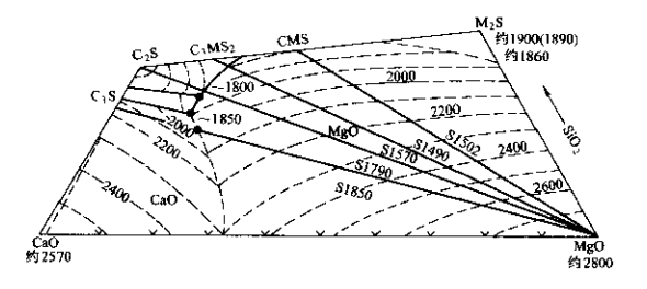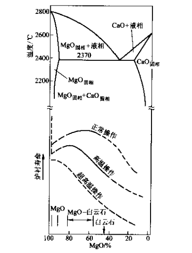 因此,含有較高CaO的MgO-CaO系耐火材料能保證它們在同熔渣接觸時提高熔渣相的堿度和粘度,從而可以抑制顆粒間熔渣剩余物的滲透。但是,也存在一個最佳MgO/Ca0比例問題。圖3-1示出了在轉爐冶煉中的最佳MgO/CaO比例隨冶煉條件的變化情況?紤]到電爐終渣的CaO/SiO₂在1.8~3.5之間,如果用圖1來解釋電爐熔池工作襯時,由于電爐的操作溫度一般都很高,因而認為用于電爐堿性耐火混合料中的最佳MgO/CaO比例也不應該太低。