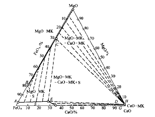 圖2 FeOn-CaO-MgO與Fe共存時于1600℃的狀態圖(MK為固溶體,S為熔液)