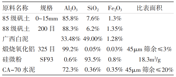 普通的澆注料一般由0~15mm的高鋁骨料60%~70%,細粉10%~25%,硅微粉3%~7%,氧化鋁粉3%~7%,高鋁水泥結合劑5%~15%,配以三聚磷酸鈉和六偏磷酸鈉作為減水劑,加水攪拌后進行澆注作業。為消除泵送過程中不不利因素,本試驗在普通澆注料的基礎上作了一些改進。一方面是調整了顆粒級配,同時添加了增稠劑,使澆注料的粘度增加,保證泵送過程中顆粒和粉料不分離;另外一面添加了緩凝劑,延長澆注料的凝固時間,保證泵送過程中不發熱凝固。試驗過程中同時對每一種原料都制定了嚴格的質量要求。理化指標見表1。