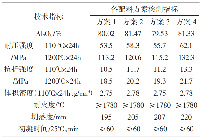 根據以上配料方案進行制樣,然后進行物理和化學指標測試。同時參考泵送混凝土的可泵性指標,主要采用單點試驗法,以坍落度試驗進行評價,因此對本澆注料的坍落度也進了測試,其結果見表3。